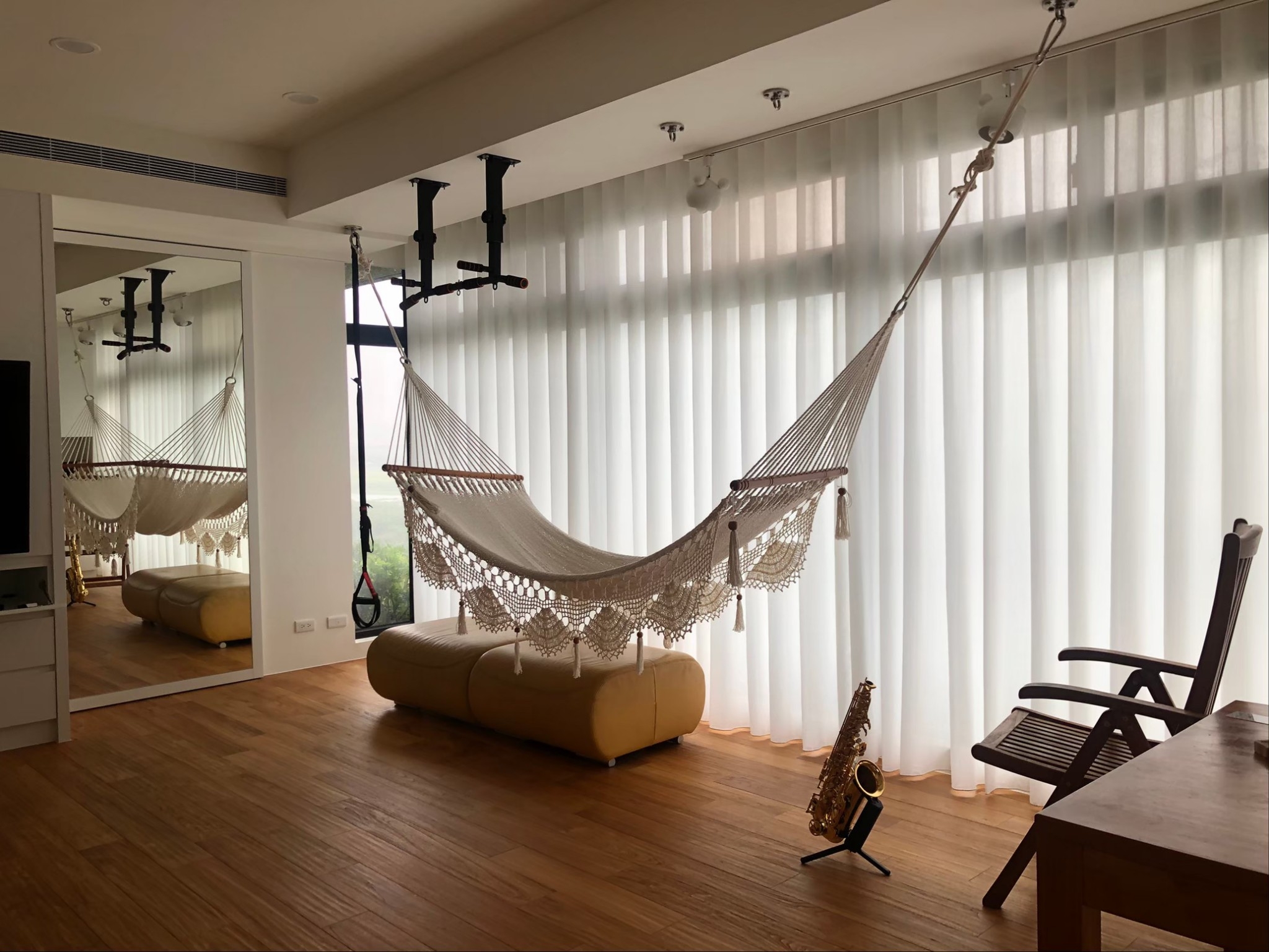 其實在客廳這樣需要明亮度的空間,單做紗簾是蠻常見的作法。只要空間沒有直曬問題、遮光需求,單做一層紗的視覺效果絕對不亞於布簾。它不僅是柔化光線的擺設,更是美化空間氛圍的好幫手。